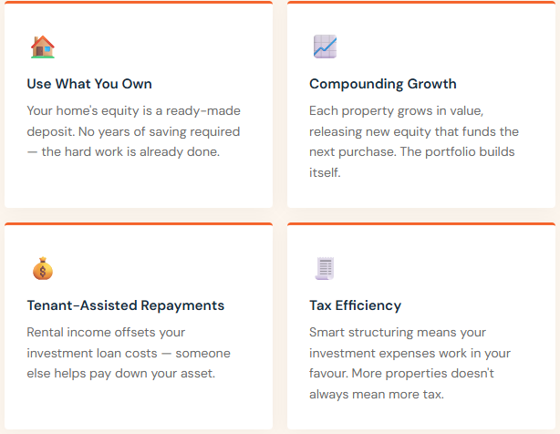 As your investment property grows in value, you access that new equity to fund property number two. Then number three. This is the duplication strategy and it's how everyday families build portfolios that genuinely change their financial future.